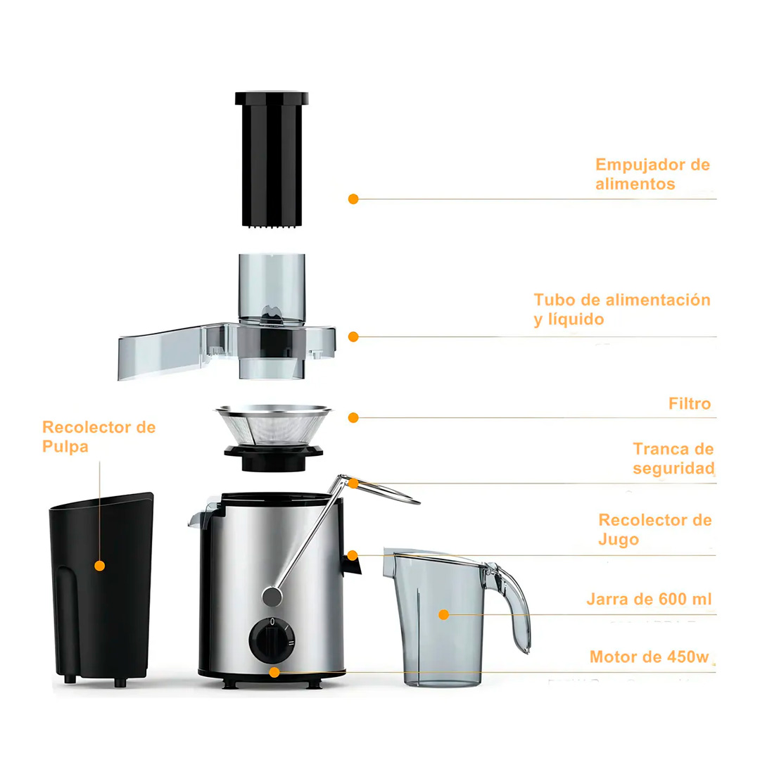 La Juguera Cuori Succhi CUO3635 es un extractor de jugos eléctrico diseñado para ofrecer un rendimiento eficiente y práctico en la preparación de jugos frescos. Con una potencia de 450W y un filtro de acero inoxidable, permite extraer jugo de frutas y verduras con facilidad.